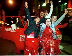 The "russ" - final year students who traditionally wear red or blue overalls depending on their line of study - compete with each other in extreme drunken debauchery, with certain tasks earning them the right to add knots to dangle from their caps.